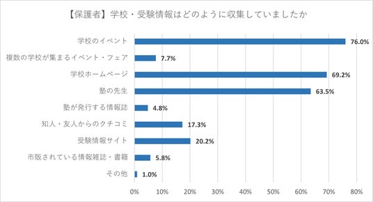 保護者に、学校や受験情報をどのように収集していたか聞いたところ、「学校のイベント」が76.0%と最も多かった。その他にも、「学校ホームページ」69.2%、「塾の先生」63.5%となり、主に学校や塾から情報を得ていることが分かった。