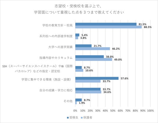 受検生・保護者ともに最も重視したポイントは「教育方針・校風」で、受検生の81.5%、保護者の88.5%にのぼった。
