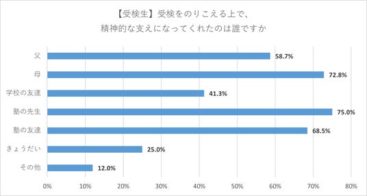 受検生に、受検を乗り越える上で精神的な支えとなった人を聞いたところ、「塾の先生」が75.0%と最も高く、次いで「母」が72.8%と、受検生にとって、周囲の大人が支えとなっていることが分かった。また、「塾の友達」も68.5%となり、大人だけでなく友人も受検勉強の支えになっているようだ。