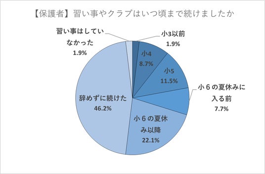 受検生の保護者に、習い事やクラブを続けた時期を聞いたところ、46.2%が「辞めずに続けた」と回答し、「小6の夏休み以降」と回答した保護者は22.1%だった。多くの受検生が小学6年生の夏以降も習い事やクラブを継続しており、受検勉強と両立していることが明らかとなった。
