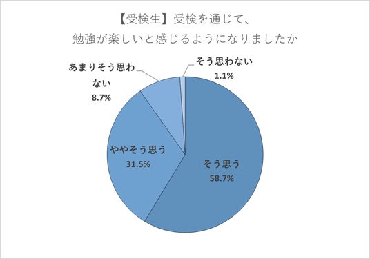 受検生に、受検を通じて勉強が楽しいと感じるようになったかを聞いたところ、「そう思う」が58.7%、「ややそう思う」が31.5%となり、受験を通じて勉強を楽しいと感じるようになった受検生は9割にものぼることが分かった。