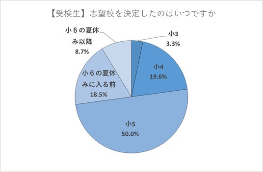 志望校を決めた時期を受検生に聞いたところ、「小5」が最も多く50.0%だった。公立中高一貫校受検は、私立・国立中学受験と異なり、住んでいるエリアによって受検できる学校が限られるため、公立中高一貫校対策が本格化する小5時点で、すでに志望校を決めている家庭が多いと考えられる。