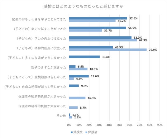 「(子どもにとって)受検勉強は苦しかった」「(子どもの)自由な時間が減って苦しかった」などの意見も見られるものの、受検生・保護者とも、受検を通じて得られたものがあったと感じているようだ。