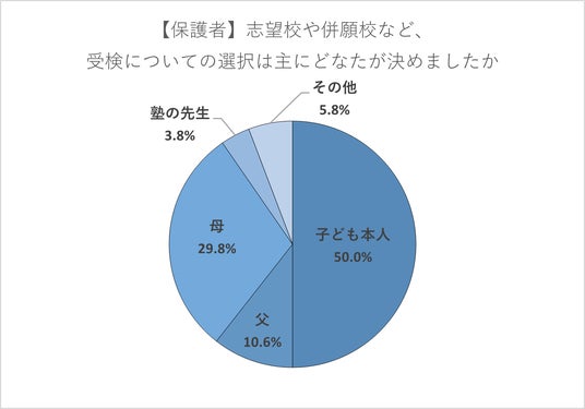 受検生の保護者に、受検についての選択は主に誰が決めたかを聞いたところ、50.0%の保護者が「子ども本人」と回答した。中学受検を最初に考えるのは、「母」と「子ども本人」がほぼ同程度だったが、中学受検を決めてからの学校選びなどは、保護者や塾の先生よりも受検生本人が主体で進めている家庭が多いことが分かった。