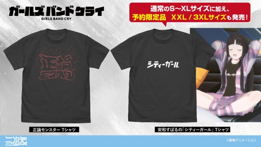 アニメ『ガールズバンドクライ』より、真正面からぶつかっていくには欠かせない一着「正論モンスター Tシャツ」をはじめ、第4話ですばるが着用しているルームウェアのTシャツを再現した「安和すばるの「シティーガール」 Tシャツ」が二次元コスパから新たに登場です。