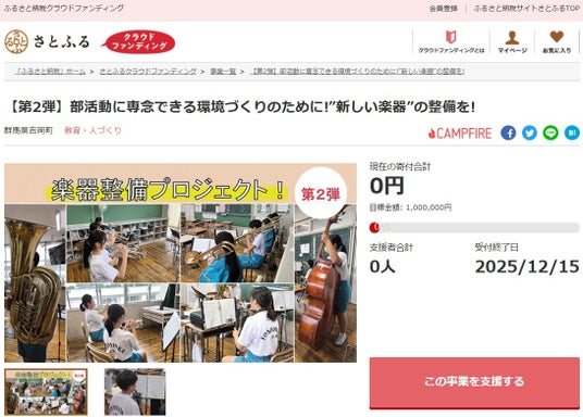 群馬県吉岡町とふるさと納税ポータルサイト「さとふる」を運営する株式会社さとふる(本社:東京都中央区、代表取締役社長 兼 CEO:藤井 宏明)は、「さとふるクラウドファンディング」にて、「【第2弾】部活動に専念できる環境づくりのために!“新しい楽器”の整備を!」の寄付受け付けを2025年9月17日より開始します。なお、本事業は2024年から継続して寄付募集をしており、今回で2回目となります。