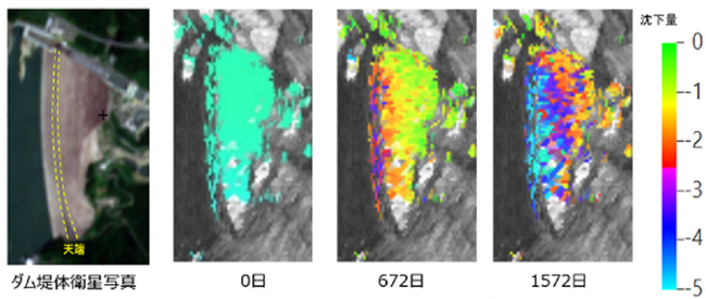 合成開口レーダ(SAR)データを用いた差分干渉解析により、ダム等の大規模構造物の変状をmm~cmオーダーで検出することが可能です。