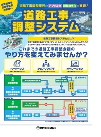 道路工事調整会議のデジタル化(ペーパーレス化、オンライン化)を実現するシステム。これまでメール、郵送、FAXで行っていた作業をオンライン上で実施可能とします。