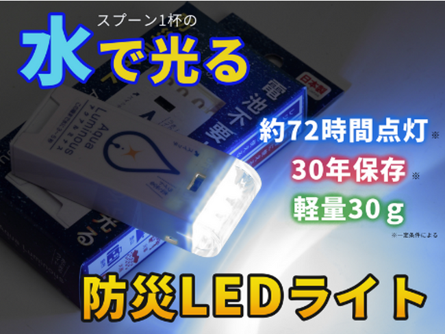 水に浸けると点灯を始めるMg電池を電源としているため、水に浸けるまでは発電しません。また、真空状態で梱包することにより湿気を遮断しているため、長期間の保存が可能に。使い切りタイプで、開封後は連続72時間点灯。