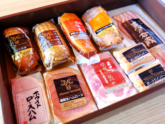 炭焼き焼豚、炭焼きみそ漬け焼豚、釜炊きチャーシュー、ホワイトロースハム、合鴨スモークブレスト、燻製生ハムロース(スライス)、恵乃石蔵山桜ベーコン(スライス)、肩ロース燻製岩塩ハム(スライス)、ポークウインナーが入った1万円相当のバラエティセット。