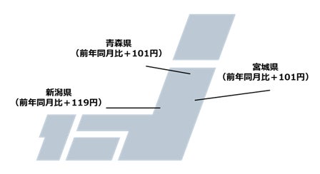 - 前年同月比の上昇額が大きい都道府県は、新潟県、青森県、宮城県。