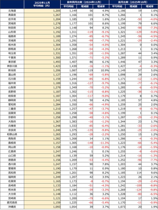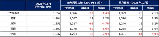 - 三大都市圏平均時給、前月比でプラス。全国平均は前年同月・前月比いずれもマイナスに。