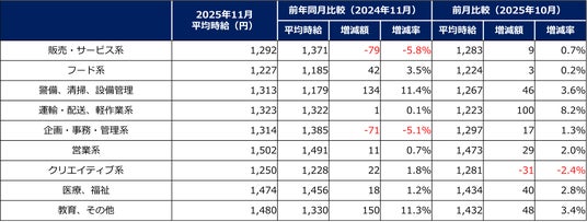 - 職種別では「警備、清掃、設備管理」「教育、その他」で、前年同月比+100円超の大幅上昇。