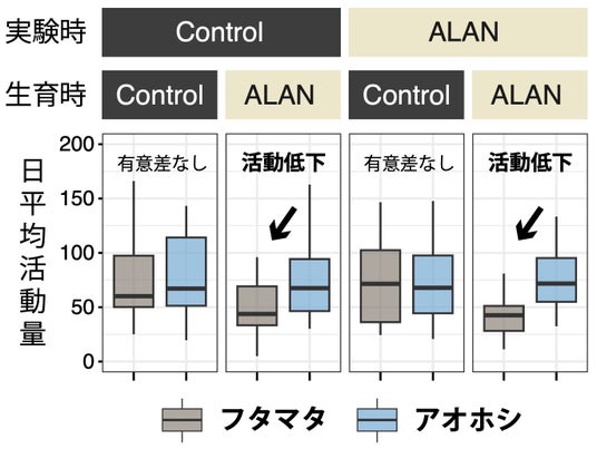 図2. 生育時のALANによる活動量の変化。郊外に生息するフタマタはアオホシに比べて活動が低下する。