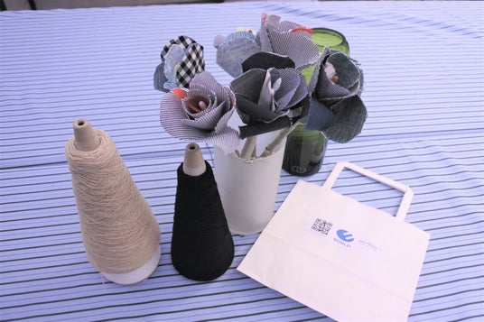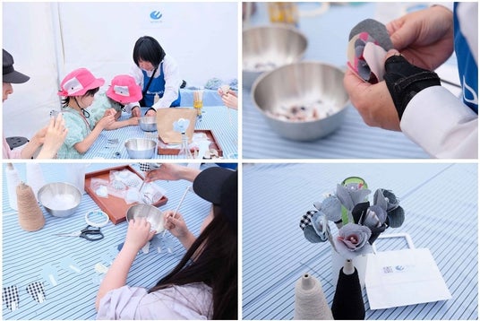 ファッションショーの協賛に加え、自社工場で洋服を作る際に出た残布や廃棄されてしまうデニム生地を活用したワークショップを開催しました。あらかじめ花びらの形に切り分けた布を、一枚一枚重なるよう両面テープでペーパーストローに貼り付け、自分だけのオリジナルローズをつくりました。母の日間近の開催ということもあり、母親や大切な人へ日頃の感謝を込めて贈るお花のプレゼントとして最適なワークショップとなりました。一般的に母の日といえば“カーネーション”を贈る風習がありますが、あえてバラの花にすることで「母の日=カーネーション」という固定概念から解放される「多様性と包摂性のある社会」も表現しています。