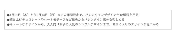 ●内 容:期間限定でバレンタインデザイン全12種類を用意しました。この時期だからこそ楽しむことができる、チョコレートやハートモチーフを使った大人かわいいデザインを取り揃えました。