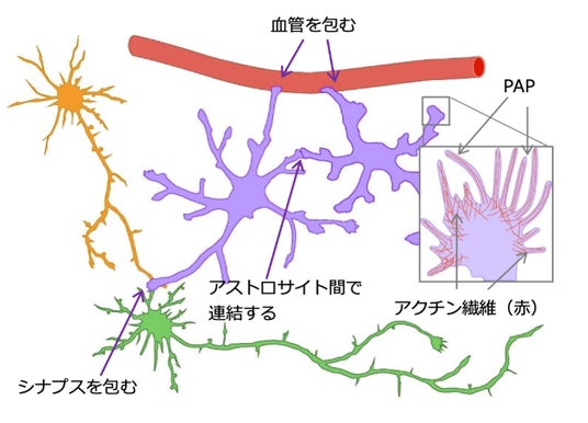 脳内には神経細胞の他に様々な細胞が存在し、細胞間相互作用によって神経ネットワークを維持しています。特にアストロサイト(星状膠細胞)は多数の分枝を持つ形態と多様な機能から「神経科学研究の次世代の星」と呼ばれることもあります。アストロサイトは細胞表面のPAP(peripheral/perisynaptic astrocyte process)と呼ばれる微小突起を介して、他の細胞に接触して神経細胞の興奮や血管からの栄養供給を制御しています(図1)。PAP の主成分は繊維構造を形成するアクチン系細胞骨格(注2)で、PAP の形態変化は記憶のメカニズムとも関係し、その形態異常はアルツハイマー病などの疾患の原因とも指摘されています。