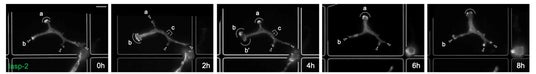 図3:アストロサイトに導入した lasp-2 は、伸長する分枝の先端部(円弧)や新しい分枝(カギ括弧)に集積し、分枝の退縮時(矢尻)は消失した