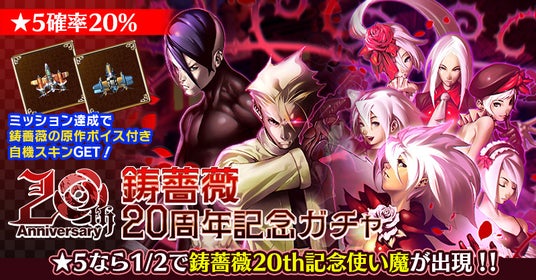 シューティングゲームアプリ『ゴシックは魔法乙女』にて、鋳薔薇20周年を記念して、『鋳薔薇』の原作イラストに20周年記念ロゴがデザインされた使い魔が登場する「鋳薔薇20周年記念ガチャ」を販売中です。