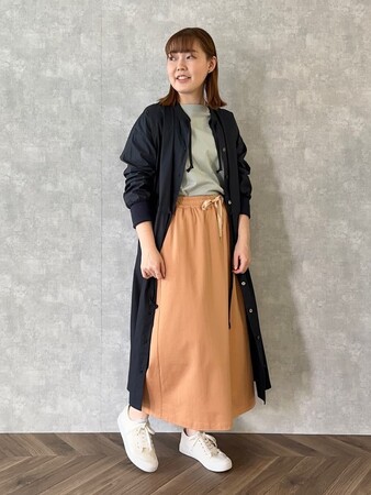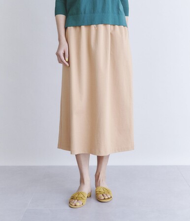 広がりすぎないフレアラインですっきり見える膝下丈スカート。カットソー素材ならではの穿き心地の良さと、シルキーな光沢の美しさを両立した上品なアイテムです。