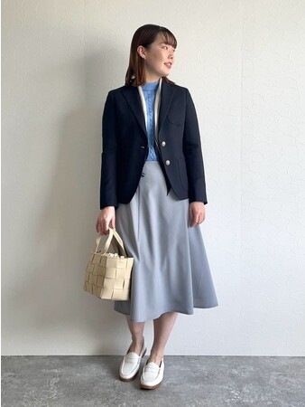 【4月】ネイビーブレザーを合わせて春のトラッドスタイルに。差し色にしたブルーのケーブルニットが、爽やかさをプラスしてくれます。