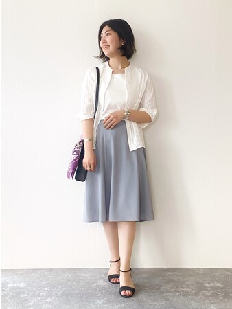 【6月】アウターの要らない日は、ブラウス1枚で軽やかに。紫陽花のようなカラーをチョイスして、この時期らしいムードを演出。