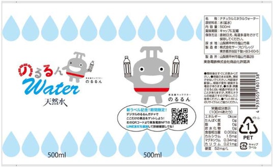 2018年3月26日より、東急線オリジナル商品として販売を行っている飲料水です。ペットボトルのキャップやラベルに、東急線キャラクター「のるるん」のイラストがデザインされており、中身は山梨県甲州市で採水されたミネラルウォーターです。本年4月下旬より順次、本キャンペーンと連携した新ラベルデザインへの切り替えを実施しています。