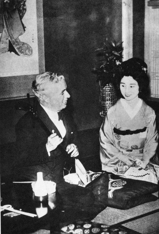 昭和七年五月、芸妓の市丸に三味線の手ほどきを受けるチャップリン