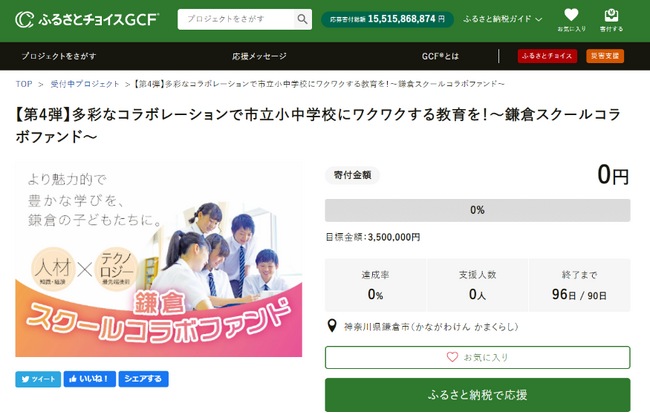 神奈川県鎌倉市(市長:松尾 崇、以下「鎌倉市」)と国内最大級のふるさと納税総合サイト「ふるさとチョイス」( https://www.furusato-tax.jp/ )を企画・運営する、株式会社トラストバンク(本社:東京都渋谷区、代表取締役:川村憲一、以下「トラストバンク」)は、11月1日トラストバンクが提供する、ふるさと納税制度を通じてクラウドファンディング型で寄付を募る仕組み「ガバメントクラウドファンディング(R)」(以下「GCF(R)」)で、子どもたちがSociety5.0を生き抜く力を育むことを目的として、学校が魅力的な人材・組織とコラボレーションしながら「社会に開かれた教育課程」を実現する「鎌倉スクールコラボファンド」事業の推進のためのプロジェクトを開始します。募集期間は2023年11月1日~2024年1月29日で、目標寄付金額は350万円です。
