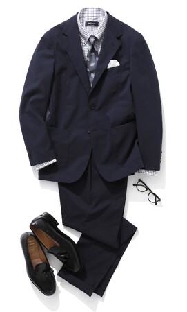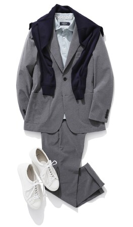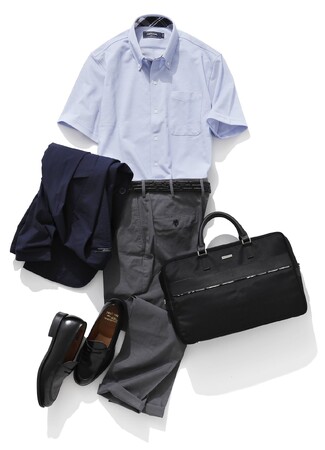 夏のオフィスワークに重宝する機能性アイテムを組み合わせたビジネススタイル。夏のジャケットスタイルはノーネクタイでVゾーンを開放的に。