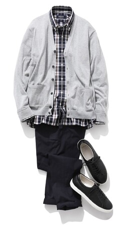 ネイビーパンツを取り入れれば、チェック柄シャツも上品で落ち着いた印象に。足元は黒スニーカーでこなれ感をプラスし、ビジネススタイルとは違ったテイストのスタイリングを愉しめます。