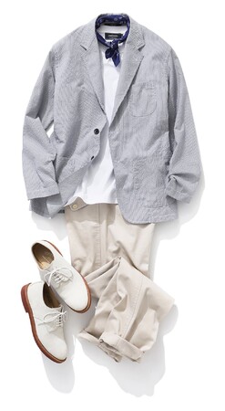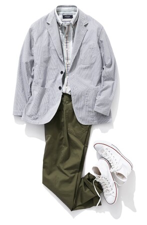 淡いグリーンが特徴のオルタネイトストライプシャツと、同色の5ポケットパンツを合わせたアーシーなコーディネート。シャツとボトムで春のイメージを残しつつ、白さ際立つジャケットで爽やかな夏の気分を先取り。