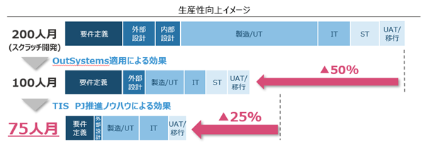 そこでTISは、再構築にかかる工数と時間の削減を目的にスクラッチ開発ではなく、視覚的でモデル駆動型であり、またAIアシストアプローチを用いたアプリケーション開発を可能にするローコードアプリケーションプラットフォーム「OutSystems」を活用し、アジャイル方式によるシステム再構築を提案しました。