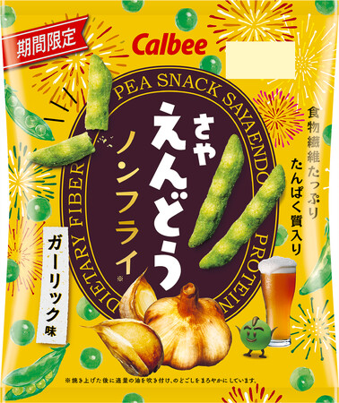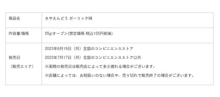 カルビー株式会社(本社:東京都千代田区、代表取締役社長:江原 信)は、発売30年目を迎えるぎっしりつまった「えんどう豆」のおいしさが楽しめるロングセラー商品「さやえんどう」ブランドより、夏のおつまみにピッタリな『さやえんどう ガーリック味』を2023年6月19日(月)から全国のコンビニエンスストア先行で期間限定発売します。コンビニエンスストア以外の店舗では、2023年7月17日(月)から期間限定発売します。(2023年9月下旬終売予定)。