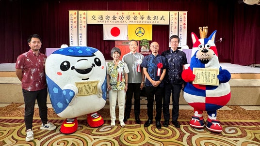この度、琉球ゴールデンキングスは、沖縄県警察本部長および沖縄県交通安全協会連合会会長連名表彰式にて「交通安全功労団体」として表彰を受けました。8月19日(火)にパシフィックホテル沖縄にて贈呈式が行われ、琉球ゴールデンキングスから佐々木淳取締役およびゴーディーが出席いたしました。