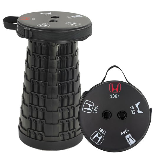 1963年から現在に至るまで、Honda の歴代 H ロゴの変遷を一面にあしらった折り畳みスツールは本田技研工業の正式ライセンスを取得した公認アイテム。
