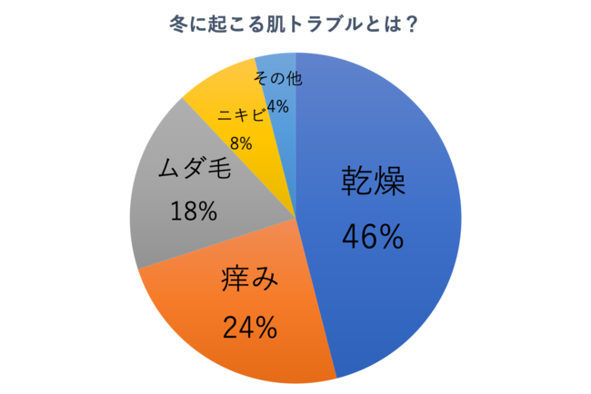 という結果になりました。冬は空気が乾燥する為お顔や体の肌バリアが弱くなり、1位は乾燥、2位は乾燥を伴う痒みという回答が挙がりました。気になったのは3位の『ムダ毛』。肌の露出が少ない冬でも、意外と見られていたり気になるムダ毛が肌悩みの上位にランクインしました。4位はニキビということで、乾燥によるインナードライが起きることで、皮脂が過剰分泌されニキビができてしまうという結果でした。
