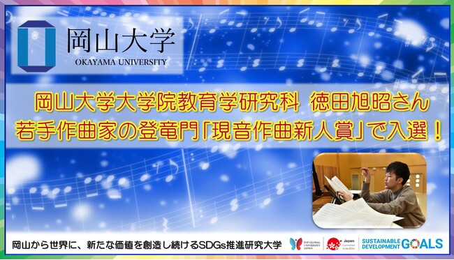 国立大学法人岡山大学(本部:岡山市北区、学長:槇野博史)大学院教育学研究科教職実践専攻2年の徳田旭昭さんが若手作曲家の登竜門ともいわれるコンクール「第39回現音作曲新人賞本選会」に出場し、見事入選を獲得しました。