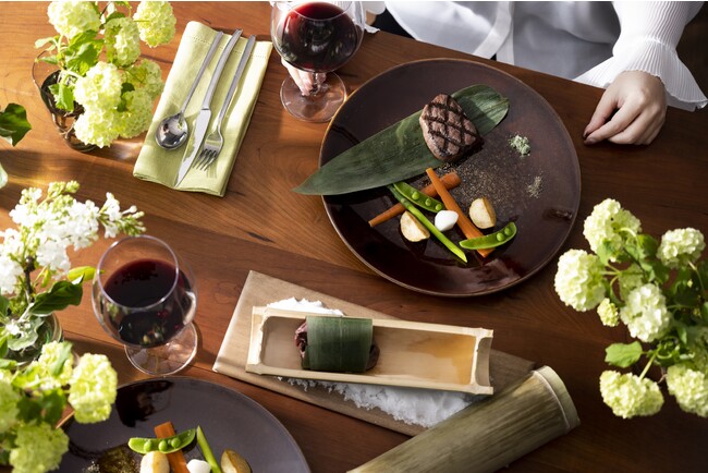 前菜は、信州ならではの食材を個性ある組合せで楽しめる、二皿仕立てにてご用意いたします。まずは、森林の香りのアイススモークと共にご提供する、瑞々しい夏野菜と鹿肉を。軽井沢の夏の涼やかさを、香りにも味わいにも感じていただけます。続く一皿は、夏の渓流を彷彿とさせる鮎と、エピスのアクセントが効いた丸ナスで、信州の素材の味をお楽しみください。信州サーモンとホタテ貝をフランスの伝統的な手法で蒸した魚料理は、さっぱりとしたキュウリのクーリと合わせて。美しい彩りもお楽しみいただける一皿です。夏らしい竹の器でご提供するメインは、笹の葉に包まれた信州プレミアム牛フィレ肉。ほのかな笹の香りと共に広がる、やわらかくジューシーな牛肉の旨味が、信州の誇る長野ワインにもぴったりな逸品です。