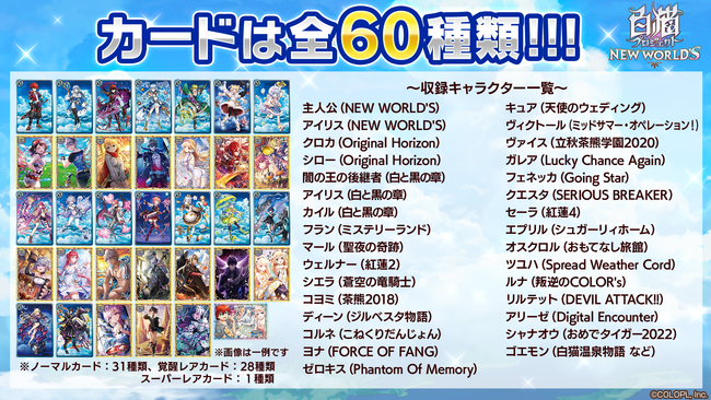 カード種類:全60種類(ノーマルカード:31種類、覚醒レアカード:28種類、スーパーレアカード1種類)