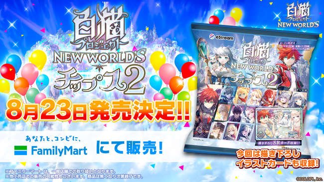 株式会社CyberZ(本社:東京都渋谷区、代表取締役社長:山内隆裕)の連結子会社、株式会社eStream(本社:東京都渋谷区、代表取締役社長:高井里菜)は、8周年を迎えた人気ゲームアプリ『白猫プロジェクト NEW WORLD'S』とのコラボ商品「白猫プロジェクトチップス2」の発売を決定いたしました。ゲームに登場するさまざまなキャラクターが、全60種類のオリジナルカードになってランダムで1枚付いてきます。
