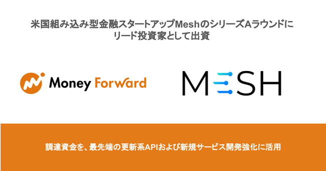 株式会社マネーフォワードは、米国の組み込み型金融スタートアップであるMeshのシリーズAラウンドに、リード投資家として出資を実行します。本ラウンドにはGalaxy、Sumsung Nextなども参画し、調達した資金は最先端の更新系APIおよび新規サービス開発の強化に充てられる予定です。Meshの社外取締役には、当社海外戦略担当グループ執行役員でありMoney Forward AmericaのCEOを務める木村慎治、および米国YodleeにてCEOを務めた実績のあるAnil Arora氏が就任し、経営体制を強化する予定です。