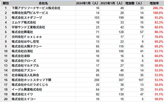 (※増加率=(2025年従業員数 - 2024年従業員数) ÷ 2024年従業員数 × 100)
