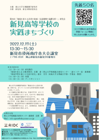 国立大学法人岡山大学(本部:岡山市北区、学長:槇野博史)の岡山大学文明動態学研究所は、第4回「地域を変える若者の参画-先進事例の基礎分析-」研究会を2022年12月17日(土)、新見市役所で開催しました。会には50名が参加しました。