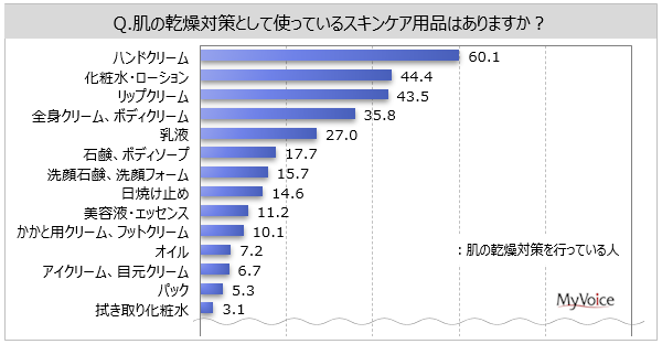 ■肌の乾燥対策として使っているスキンケア用品は「ハンドクリーム」が乾燥対策実施者の6割、「化粧水・ローション」「リップクリーム」が各4割強。男性10・20代では「化粧水・ローション」が6割弱