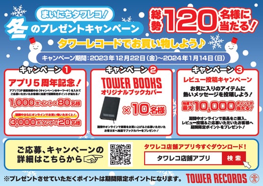 タワーレコードは12月22日(金)から1月14日(日)にかけて、『まいにちタワレコ!冬のプレゼントキャンペーン』を開催。ポイント進呈やオリジナルブックカバーの抽選プレゼント、レビュー投稿キャンペーンといった総勢120名が対象の施策を実施します。