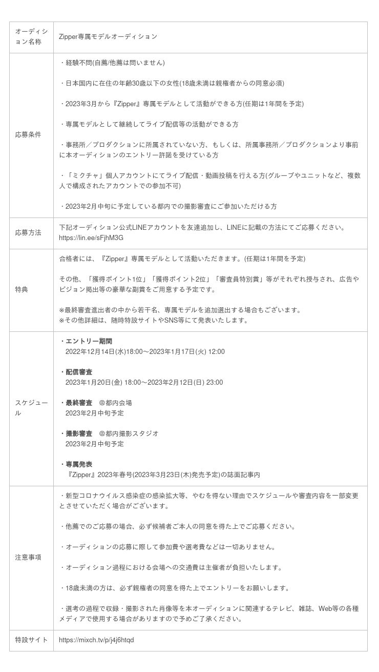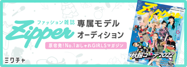 本オーディションは、「ミクチャ」によるライブ配信と動画投稿による審査を行いファイナリストを選出し、都内会場でのオフライン面接を経て合格者を決定します。なお、合格者は『Zipper』2023年春号(2023年3月23日(木)発売予定)の誌面にて発表され、その後『Zipper』専属モデルとして1年間ご活躍いただきます。