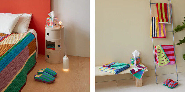 デザイナーのEllen van Dusen(エレン・ヴァン・デューセン)は、2010年にブランド「Dusen Dusen」を立ち上げ、多彩なシルエットにオリジナルのプリントを施したウィメンズウェアを発表しました。2015年には、タオル、バスローブ、ティッシュボックス、ゴミ箱などを揃えた「Dusen Dusen Home」を発表し、ブランドを拡大しました。鮮やかな色とストライプが特徴的なデザインは、ファインアートや、人間の脳が色にどのように反応するかというヴァン・デューセンの研究からインスピレーションを得ています。