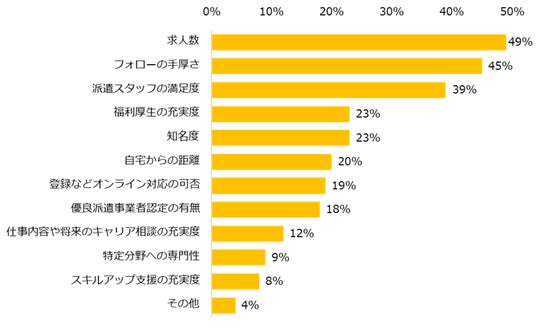 続いて、派遣会社を選ぶ際に気になるポイントを伺うと、上位は「求人数」(49%)、「フォローの手厚さ」(45%)、「派遣スタッフの満足度」(39%)でした。具体的な理由も紹介します。