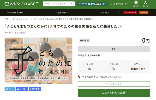 埼玉県白岡市(市長:藤井 栄一郎、以下「白岡市」)と国内最大級のふるさと納税総合サイト「ふるさとチョイス」( https://www.furusato-tax.jp/ )を企画・運営する、株式会社トラストバンク(本社:東京都渋谷区、代表取締役:川村憲一、以下「トラストバンク」)は、本日11月2日トラストバンクが提供する、ふるさと納税制度を通じてクラウドファンディング型で寄付を募る仕組み「ガバメントクラウドファンディング(R)」(以下「GCF(R)」)で、子育てのための複合施設整備への支援を目的としたプロジェクトを開始します。募集期間は2023年11月2日~2024年1月31日で、目標寄付金額は300万円です。
